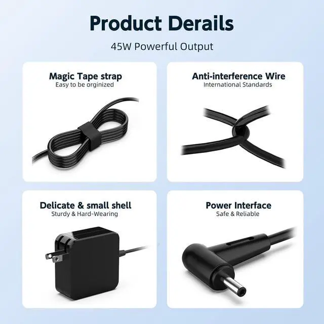 * 1.35 mmImportant: Not Fit for 4.5 * 3.0 mm & USB-C - Do not buy if your laptop requires more than 45WBuilt with high-quality materials this adapter provides over-voltage over-current and short-circuit protection ensuring the safety of your devices while chargingThe 90 ° foldable plug ultra-thin and lightweight design makes it easy to put it in your pocket or bag for travel or business trips and can charge your devices anytime anywherePackage: 1x Ac Power adapter & 1x Ac power cable