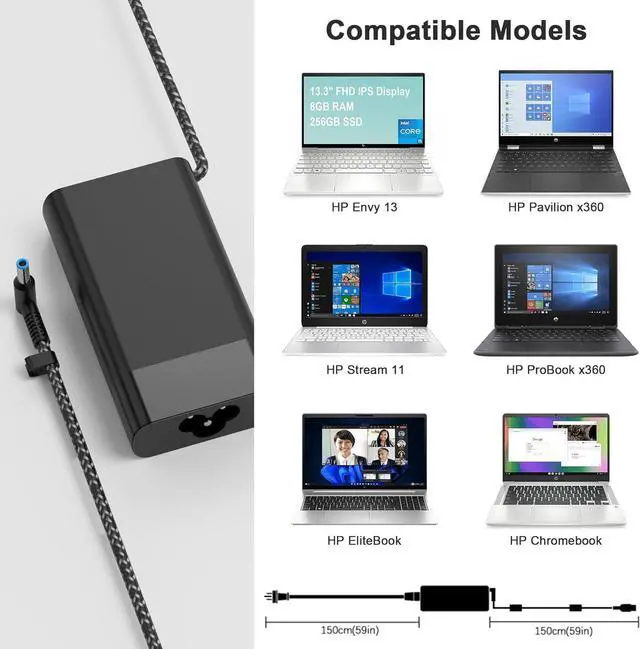 Compatible with HP 65W Charger Compatible With HP Pavilion x360 11 13 15 m3, HP Stream 11, 13, 14, Compatible With HP ProBook x360 435 G7 G8 G9, HP ProBook x360 11 G1 G2 G3 G4 G5 G6 EE, 450-G3 450-G4 450-G5 650-G2 650-G3 650-G4 455-G3 455-G4 455-G5 455-G6 470-G3 470-G4 470-G5 640-G2 640-G3 640-G4 645-G2 645-G3 645-G4; HP EliteBook 820 840 850 G3 G4 G5, 725-G3 725-G4, 745 G3 G4, 755 G3 G4 Folio 1020 G1 G2, 1030 G1 G2 G3, 1040 G1 G2 G3 G4 G5; Chromebook 11 EE G2 G3 G4, Notebook 15, Zbook and more hp computer