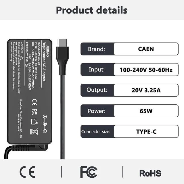 USB C Type-C Charger 65W, Input: 100-240V 50-60Hz, Output: 65W-20V 3.25A -TYPE-Calso Compatible with 45W
