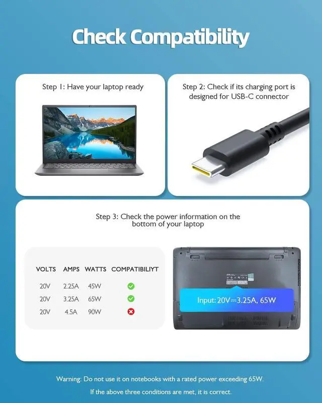 Superb Compatibility: Fit for ALL 65W-45W laptops with USB-C power connector including Latitude Inspiron series and more.