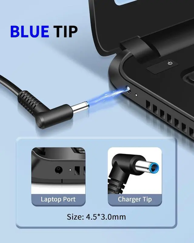 Connector Type: 4.5 x 3.0 mm Blue Tip (Not 7.4 x 5.0 mm or 4.8 x 1.7 mm)Compatibility: 65W charger compatible with HP Elitebook 830 / 840 G3 G4 G8 / 850 G3 G4; ProBook 430 G8 / 440 G8 / 450 G3 G8 / 640 G2 G3 G4 / 650 G2 G3; Pavilion x360 / Stream 11 Pro G3 / Stream 11 Pro G4 EE / Chromebook 11 EE G2 G3 G4 / Spectre x360 x2 / Notebook 15 / Zbook LaptopIntended for