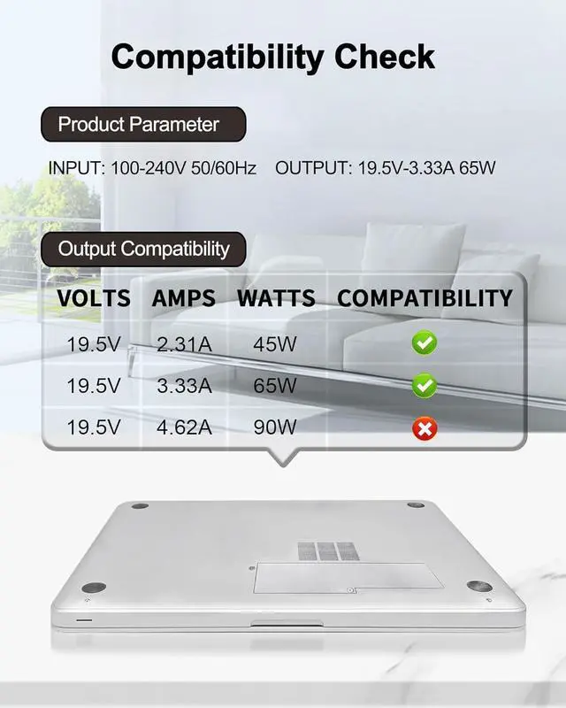 Output: 19.5V - 3.33A 65W (also compatible with 19.5V 2.30A 45W laptop);