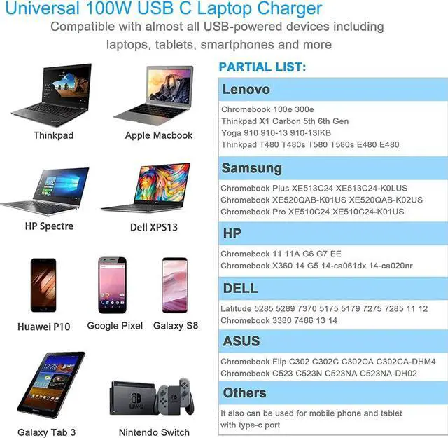 This 100W USB-C charger is designed to automatically detect and determine the correct power requirements for your device supporting the USB-C PD 3.0 charging protocol to charge your laptop at a faster speed whether you're working or relaxing in bed. With a high power output of up to 100W it can quickly charge devices with a USB-C port in just a short amount of time making it ideal for both office use and travel. 100W usb c Laptop Charger Compatible with 96W Mac book Pro charger usb c for Thinkpad/ IdeaPad/ Yoga/ Chromebook HP Chromebook Charger XPS/ Latitude Chromebook chromebook Google chrome Computer