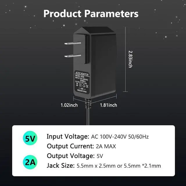 Compatibility: Output voltage must be equal to 5v and the maximum output current is 2A. This means it can provide all currents less than 1000mA such as 5v 2A 1.5A 1A 0.8A 0.5A 2000mA 1800mA 1600mA 1000mA 800mA 600mA 500mA 400mA 300mA 100mA etc. dc 5v power cord an ideal 5v power supply AC adapter replacement for a damaged or lost adapter.