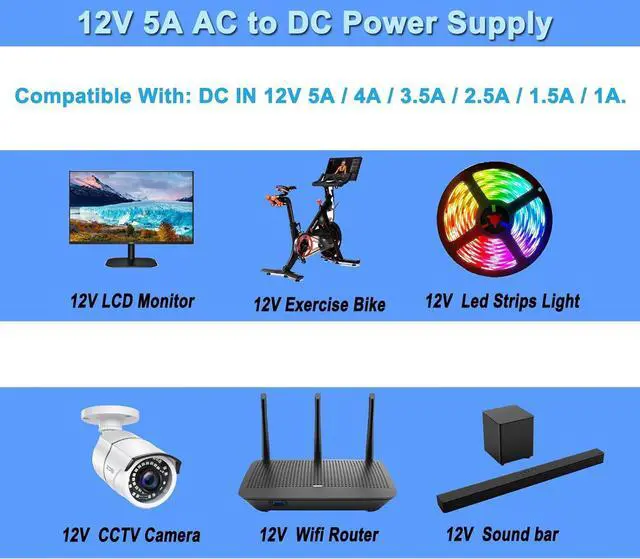 UNIVERSAL POWER SUPPLY WIDE APPLICATION: ] The 12V 5A home camera ac dc power supply converter rated output 5.0 Amp perfect for DC 12V electronics with no more than 60W wattage. such as fit for dc 12V 5A 5000mA 4A 4000mA 3.5A 3500mA 3A 3000mA 2A 2000mA 1A 1000mA devices.