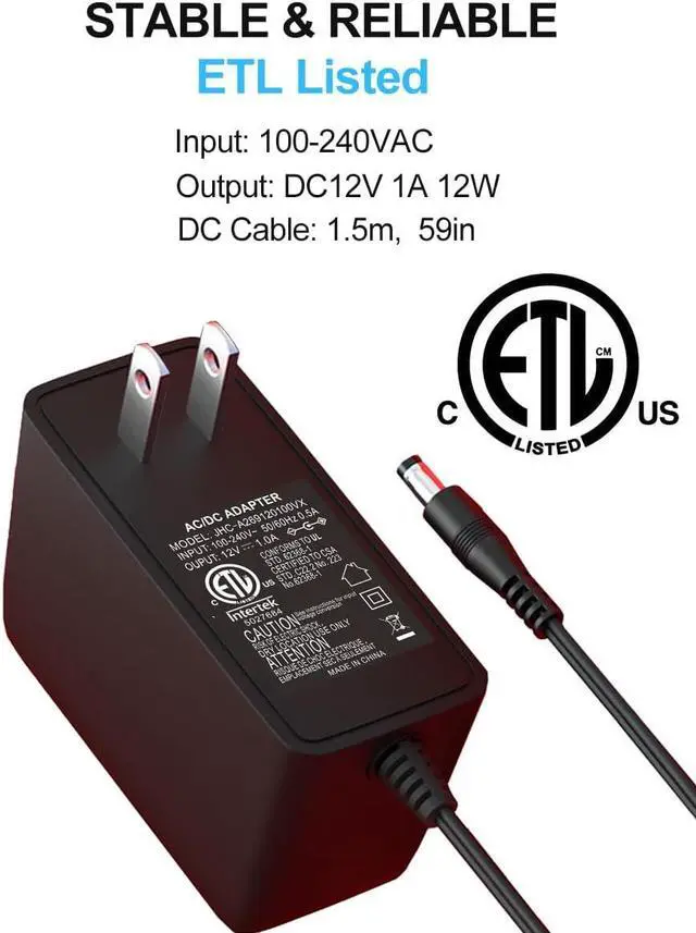 Input AC 100V-240V 50/60Hz; Output 12Vdc 0-1000mA 12Watt / 5 Ft ( 1.5 m) Power Cable / 2.1 mm x 5.5 mm Center Positive Barrel Plug; Works with device that draws less than 1A such as 200mA 300mA 500mA 600mA 650mA 700mA 800mA 900mASafety: Level VI Energy Efficiency. UL cUL
