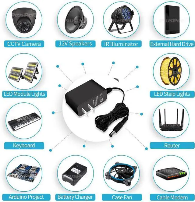 W): Dome Bullet CCTV Security Cameras / DVR NVR Surveillance System / Computer PC Case Fan / Night Vision IR Camera Illuminator / 12V motor / Arduino / Mini Spy Pinhole Security Cams / Game Trail Hunting Camera / And other Small Power Devices (1) indoor use only. (2) You can aslo cut off the dc plug and connect the wire directly for some special usages (Dotted line is negative).