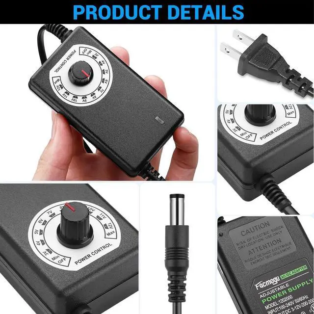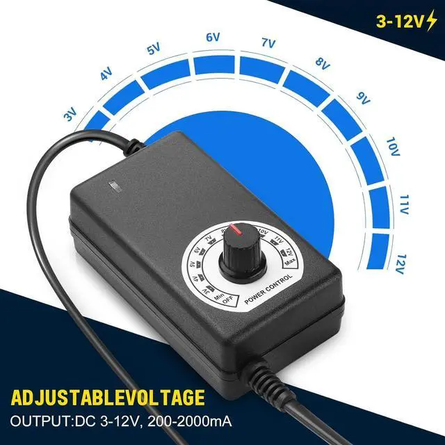 Multi-Voltage Power Supply-- Input Voltage AC 100V-240V 50/60Hz Output Voltage ranging from DC 3V ~ 12V up to 2A (2000mA) 24W Max. Perfectly meet a variety of indoor electronics. Please choose correct voltage before plug it to your device. Wrong voltage may damage your deviceVoltage Adjustable-- Easy to use with the switch knob. The controller is not only suitable for speed regulation but also for dimming and temperature regulation. The multi-speed controller allows you to set the fan's speed to the optimal level of noise and airflowPlug Design-- Fit for both 5.5 x 2.5 mm & 5.5 x 2.1 mm plug.