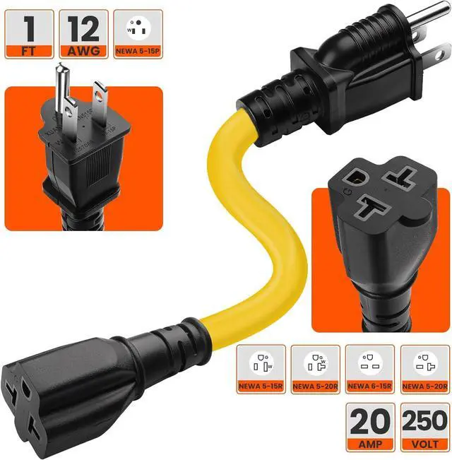 Universal CompatibilityConnect Nema 5-15P 15-AMP Male (125V) to Nema 5-15R 15-AMP Male (125V) Female Nema 5-20R 20-AMP Male (125V) Female Nema 6-15R 15-AMP Male (250V) Female ac adapter Nema 6-20R 20-AMP Male (250V) Female ac adapter. Plug & Play Durable Enhanced Cable Our 15 Amp to 20 Amp plug adaptercables are designed with maintainability in mind featuring molded plugs and copper wire coating. Cooperate with indoor or outdoor use to effectively prevent surface oxidation. This durable design ensures the lifespan and reliability of the equipment giving you peace of mind about its performance and safety It is easy to install and does not require tools or knowledge of electrical wiring.
