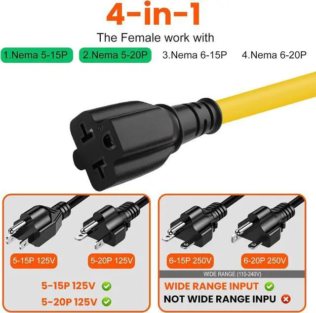 4 in 1 12AWG 15 Amp to 20 Amp Household AC Plug Adapter 15 Amp to 20 Amp plug adapter desigin to contact high power device so it neen you deviece support WIDE VOLTAGE range 110V to 220V to connect to Nema 6-15P or Nema 6-20P 15A/20A 250V ac power devices. Heavy-Duty Superior DurabilityThis Nema 5-15P to 5-20R/6-15R/6-20R adapter is molded plug copper wiring coated wire heavy duty flame retardant UV-resistant STW indoor/outdoor water resistant PVC jacket in UL 62 standard and plug in UL 817 standards. Has excellent wear resistance oxidation resistance heat resistance oil resistance and moisture resistance and is durable and long-lasting.