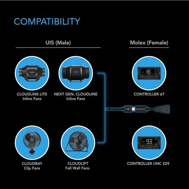 Converts the UIS? connectors of our newer fans to Molex ports so that they can work with previous generation controllers. Newer fans with UIS connectors include CLOUDRAY clip fans CLOUDLINE LITE inline fans next-gen CLOUDLINE fans. Previous generation of controllers with Molex ports include CONTROLLER UNC529 and CONTROLLER 67. Compact design ensures a secure fit while extending the connection between device and controller. Gives UIS devices access to smart controls like temp. & humidity triggers timers and backup memory.