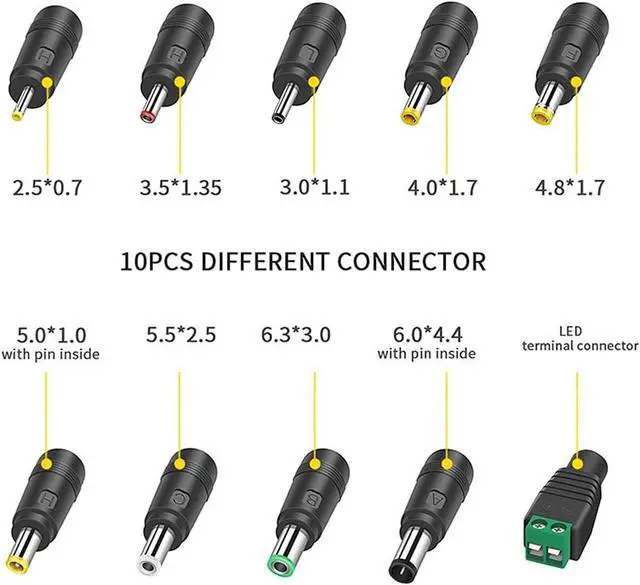 Different Sizes DC Jacks: 2.5 * 0.7; 3.0 * 1.1; 3.5 * 1.35; 4.0 * 1.7; 4.8 * 1.7; 5.5 * 2.1; 5.5 * 2.5; 6.3 * 3.026V