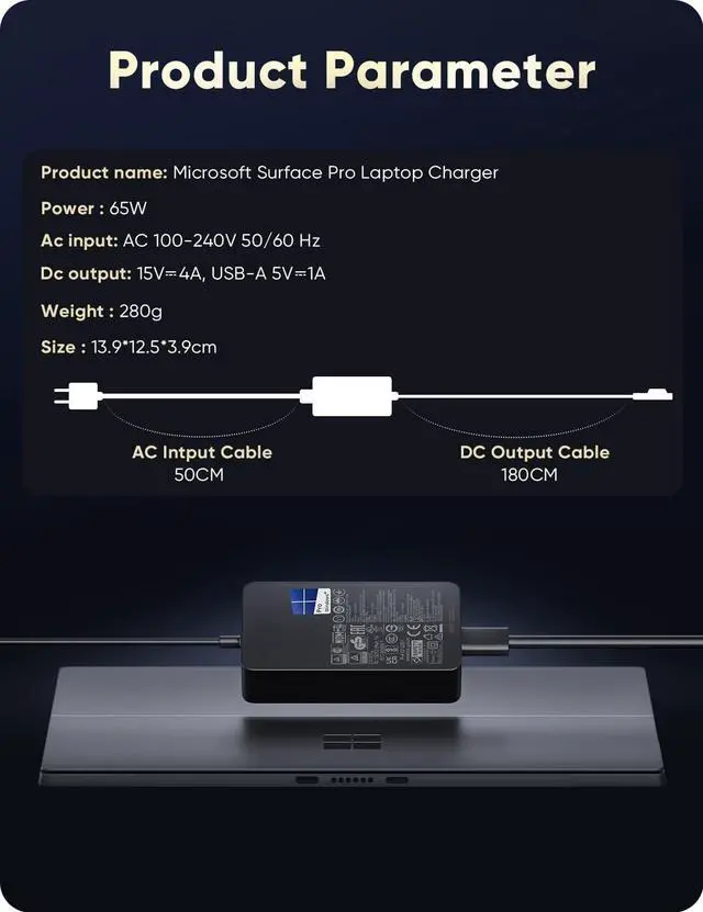 Top-Rated Surface Charger 65W for Surface ProExperience lightning-fast charging with our 65W power adapter capable of fully charging the Surface Pro 8 in just 1.5 hours. This charger is the perfect match for models including 1706 1866 1796 1724 1625 1867 1735 1800 and more. It offers superior performance compared to lower wattage chargers (44W 39W 36W 24W). Broad CompatibilityOur charger is designed to work seamlessly with a wide range of Surface devices including Surface Pro 11 10 9 8 7+ 7 6 5 4 3 X Surface Studio 1 i5 Windows Surface Laptop 6 5 4 3 2 1 Surface Book 3 2 1 and Surface Go 3 2 1.