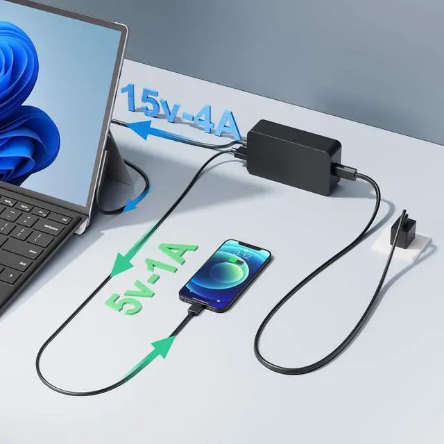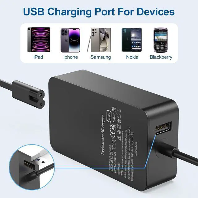 USB Port: 5V-1A 5W; And also compatible with Surface Charger 44W 36W 24W65W Surface Pro Charger Compatible with Laptop Model Surface Pro 10 Surface Pro 9 Surface Pro 8 Surface Pro 7/7+ Surface Pro 6 Surface Pro 5 Surface Pro 4 Surface Pro 3 Surface Pro X65W Surface Pro Charger Compatible with Surface Laptop Model Surface Book3/2/1 Surface Go 3/2/1 Surface Laptop Studio i5; And model 1706 1866 1824 1796 1769 1724 1625 1631 1735 1736 1943 1867 1798 etcMagnetic