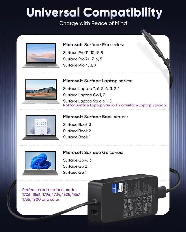 Widely compatibility: Surface Pro 11 10 9 8 7+ 7 6 5 4 3 X Surface Studio 1 i5 Windows Surface Laptop 7 6 5 4 3 2 1 Surface Book 3 2 1 Surface Go 4 3 2 1 Pro series Laptop series Book series Go series. Safety and ReliabilityOur Surface charger comes with a 10-foot cable allowing you to conveniently charge from your bed couch office or even the back seat of your car. Built-in overheat short-circuit and overload protections give you peace of mind. An innovative magnetic connector with power status indicator ensures you always know the charging status of your device. Enhanced Charging PerformanceExperience faster more efficient charging designed specifically for your device. Say goodbye to low battery issues and enjoy reliable higher performance making it the perfect charging companion for your Surface products.