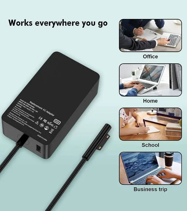 Super Fast Surface Charger - With a maximum output of 65W it can intelligently deliver power at 65W 44W 39W 36W and 24W based on your Surface device providing superior charging performance. You can even experience an increase in battery level while using your Surface thanks to its efficient charging capabilities. Additionally this surface pro charger features a USB port for simultaneous charging of your Surface and cellphone. Wide Compatibility - Compatible with Surface Book / Surface Book 2 / Surface Go / Surface Go 2 / Surface Go 3 / Surface Laptop / Surface Laptop 2 / Surface Laptop 3 / Surface Laptop 4 / Surface Laptop Go / Surface Pro (5th Gen) / Surface Pro 3 Charger / Surface Pro 4 Charger / Surface Pro 6 / Surface Pro 7 Charger / Surface Pro 8 / Surface Pro X.