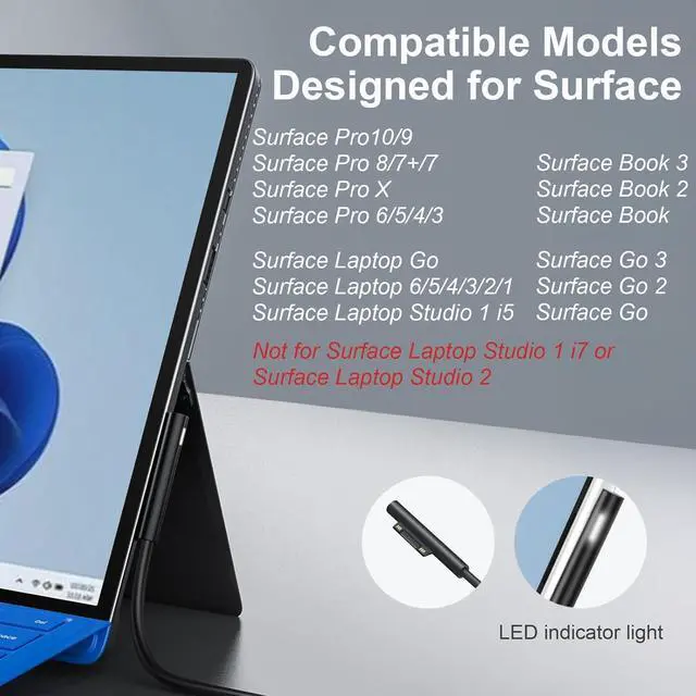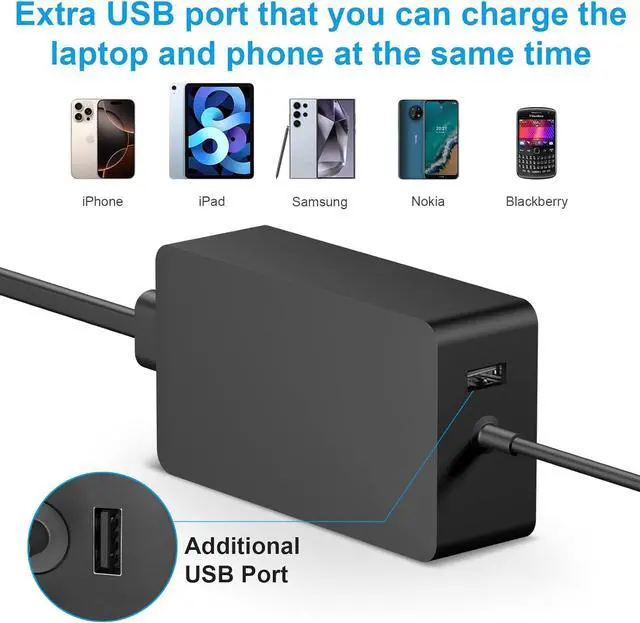USB A Port: 5V-1A 65W[Widely compatibility] Compatible with Surface Laptop 5/ Laptop 4/ Laptop 3/ Laptop 2/ Laptop 1 Surface Laptop Studio 1 i5 Surface Laptop Go 3 Surface Laptop Go 2 Surface Laptop Go Surface Pro 9 Surface Pro 8 Surface Pro X Surface Pro 7+ Surface Pro 7 Surface Pro 6 Surface Go/ Go 2/ Go 3 / Go 4 Surface Pro 5 (2017) Surface Book/ Book 2 i5Not i7/ Book 3 i5Not i7 Surface Pro 4 Surface Pro 3[Compatible with Surface Book] Compatible with Surface Pro 3 and Surface Pro 4 match surface model 1706 1866 1796 1724 1625 1867 1735 1800 and so on. [Multiple Protection Safety] Experience dependable protection and safety with our built-in multi safeguards to protect against overcharging overheating short circuiting ensuring your computer battery remains safe and extends its lifespan. [What You Get] 1 x 65W power adapter 1 x power supply cord. If you have any questions please feel free to contact us.?
