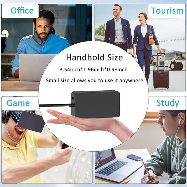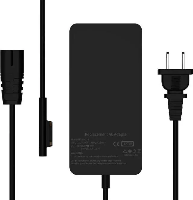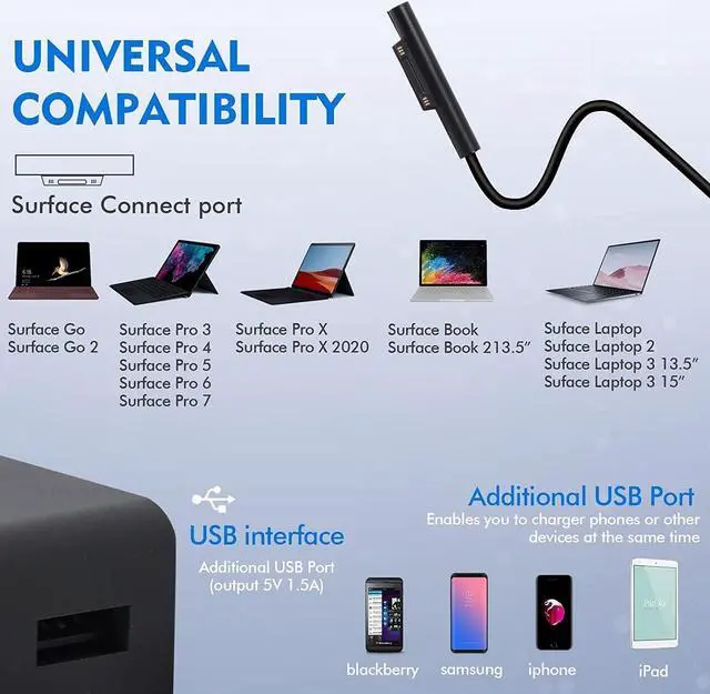 USB Port: 5V 1A USB 10ft power cord cable The surface laptop charger also work with 102W(15V 6.33A ) 65W(15V-4A) 44W(15V- 2.58A ) 36W(12V- 2.58A ) and 24W(15V- 1.6A )Safety & Durability127w surface book chargers has a built-in heat dissipation system to protect the charger from overheating at full power output. The built-in IC chip technology provides overload/short-circuit /overheat protection. all surface charger made of premium thicker copper wire and tested with over 20000+ times bend to ensure the durability. WarrantyAs a Professional Notebook Power Supplier Our 127w surface book charger are in Compliance with Top Industry Standards Include Numerous Safety Mechanisms we Offer an Industry-Leading Return and