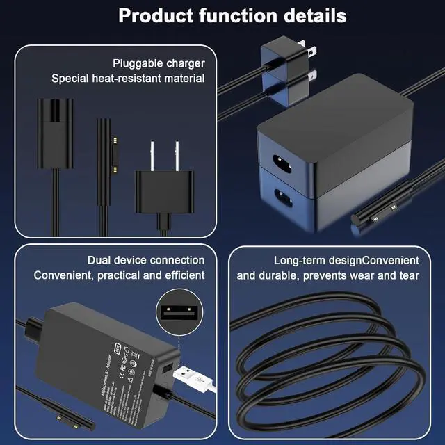 USB Port: 5V-1A 65W. Windows surface charger Includes an additional USB port for charging another device at the same time. Surface pro replacement charger built-in multi safeguards to protect against overcharging overheating short circuiting friendly to computer batterySuper