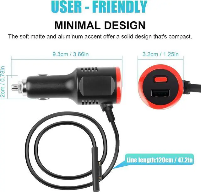 OUTPUT: DC 12V/ 2.58A DC 5V 2.1A (USB).?? Compatible withThe UL listed surface car charger power supply is designed to match your surface Pro 3 surface Pro 4 surface Pro 5 surface Pro 6 surface Laptop Surface Book Surface Pro (5th Gen) Surface Pro (2017/2018) Surface Laptop 1/2 & Surface Go.?? With USB quick chargerUSB 5V 2.1A car charger recharges the battery and another device such as your phone or iPad at the same time.?? FeaturesConvenient Protable Fits most of the Car Easy to use when traveling. Rigorous Workmanship and Durable Hard to Break and Less of DC Ripple High Efficiency and Charging Quickly.?? What You Get1 x Surace Pro Car Charger 1x 47.2 in Power Cord Contact us for return in 30 days while you are not satisfied with our product and an new product as replacement in 12 months.