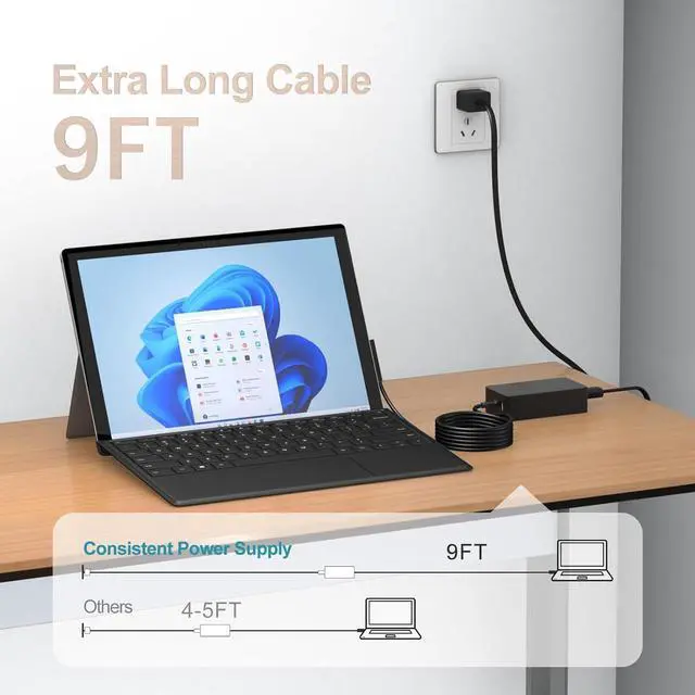 Cable and LED Indicator: The surface pro charger has a 9ft long cord giving you enough length to stretch and move anywhere. the highly sensitive plug of the cord allows you to plug and play in the family bedroom living room studio school travel and other placesWhat