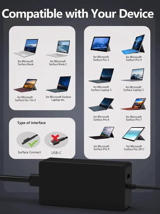 USB Port: 5V 1.5A 7.5W (USB 2.0 )Works as genuine parts 100% Compatible! CompatibleSurface Book 2 13' (18001879); Surface Book 2 15' (1798); Surface Book 2 13.5 ' (17981706); Surface Pro 9(19631706; Surface Pro 8(1706; Surface Pro 7(1706; Surface Pro 7+(1706; Surface Pro 6(1800; Surface Pro 5(18001735; Surface Pro 4(17351625; Surface Pro 3(1625; Surface Pro X(1706 Surface Laptop ChargerCompatibleSurface Laptop 5 (1706); Surface Laptop 4 (1706); Surface Laptop 3 (1706); Surface Laptop 2 (1800); Surface Laptop (17981800); Surface Laptop Studio (1706); Surface Laptop Go 2; Surface Laptop Go 3
