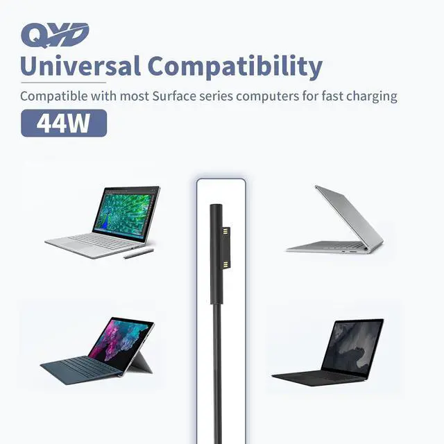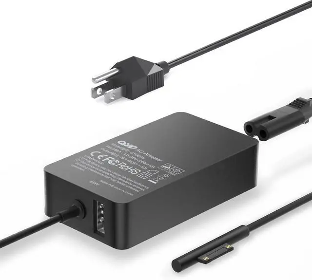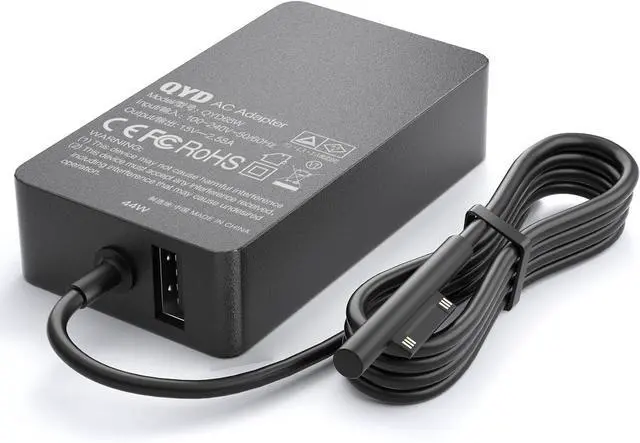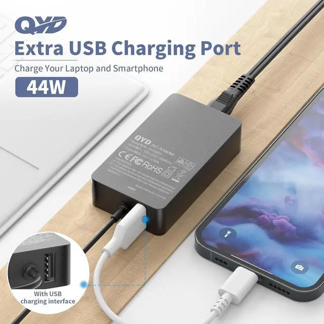 USB Port: 5V-1A. QYD 44W 15V 2.58A Laptop Charger Compatible with Surface Pro Charger Surface Pro 3 4 5th 6 7 X Surface Laptop 3 2 1 Surface Go 1 2 Surface Book 1 2 Model 1800 Surface Laptop Charger Power Supply Cord. Perfectly Compatible Replacement Laptop Charger- QYD 44W 15V 2.58A Laptop Charger Compatible with Surface Pro 3 Surface Pro 4 Surface Pro 5 Surface Pro 6 Surface Pro 7 Surface Pro X Surface Book Surface Book 2 Surface Go 1 Tablet Surface Go 2 Tablet Surface Laptop 3 Surface Laptop 2 Surface Laptop 1 surface charger. The usb port allows you to charge another device such as your phone at the same time. Plug and Charge Quickly and Conveniently-Compatible with 44W Surface Laptop Charger QYD Power Supply Adapter is compact lightweight and easy to carry when you go outside. It comes with an extra-long 10FT power cord and could be flexibly used in different occasions like home office and travel. Real Time Safety Protection-QYD 44W 15V 2.58A AC Adapter manufactured in strictly compliance with industry standards has been tested and listed by FCC/UL/RoHS which ensures that our laptop charger meets their standards and safe to use.