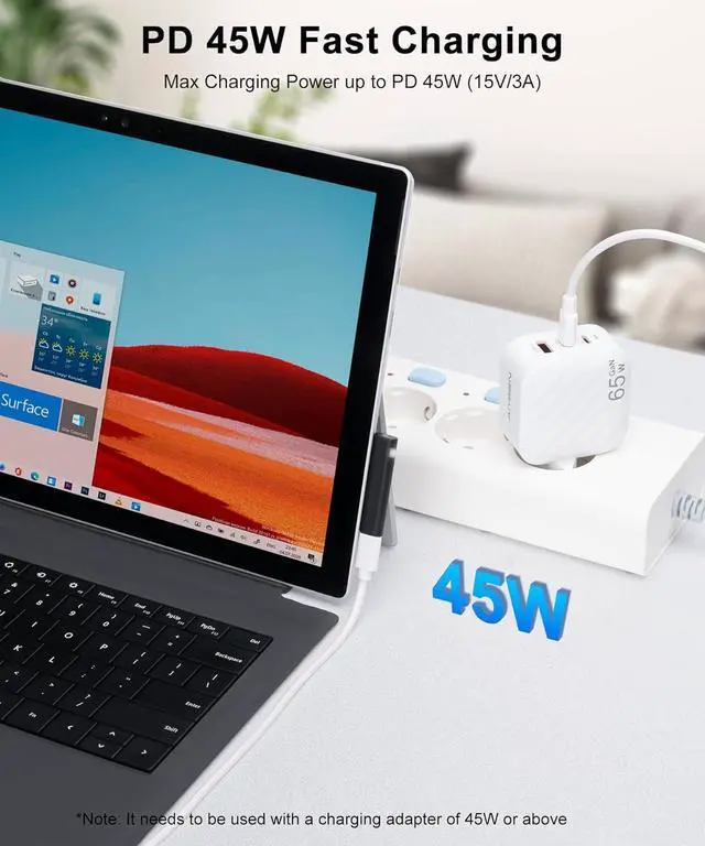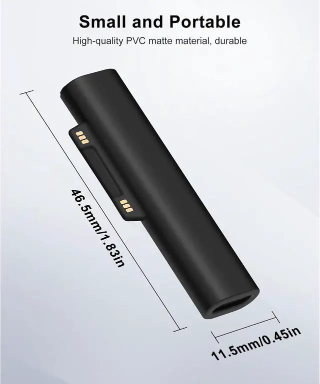 Type-C Female to Surface Interface DesignType-C female socket with PD fast charging equipment to achieve instant fast charging plug and play immediate recognitionUsing Advanced PD Induction ChipThis adapter supports 3A current fast charging stable performance maximum charging power can reach 45W (15V/3A). It needs to be used with a charging adapter and fast charging cable above 45W the maximum charging voltage must reach 15VBuilt-in PTC Hardware-level Protection to Improve the Safety of UseThis Surface Pro charger can effectively control the heat generated under abnormal use conditions improve the safety of cables and smart devices charging over-discharge/overload protection etc.