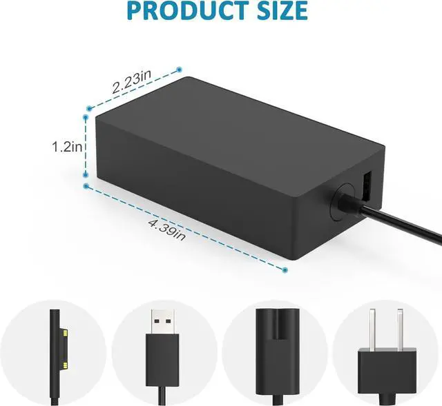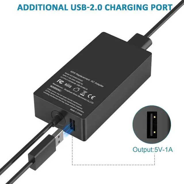 USB Port: 5V-1A 5W USB port can charge your phoneCompatible with Surface Pro 3 Surface Pro 4 Surface Pro 5 Surface Pro 6 Surface Pro 7 Surface Pro 7+ Surface Pro 8 Surface Pro 9 Surface Pro 10 Surface Pro X; Surface Laptop 1 Surface Laptop 2 Surface Laptop 3 Surface Laptop 4 Surface Laptop 5 Surface Laptop 6; Surface Book/Book 2/Book 3; Surface Go Surface Go 2 Surface Go 3; Surface Laptop Studio chargerAdvanced