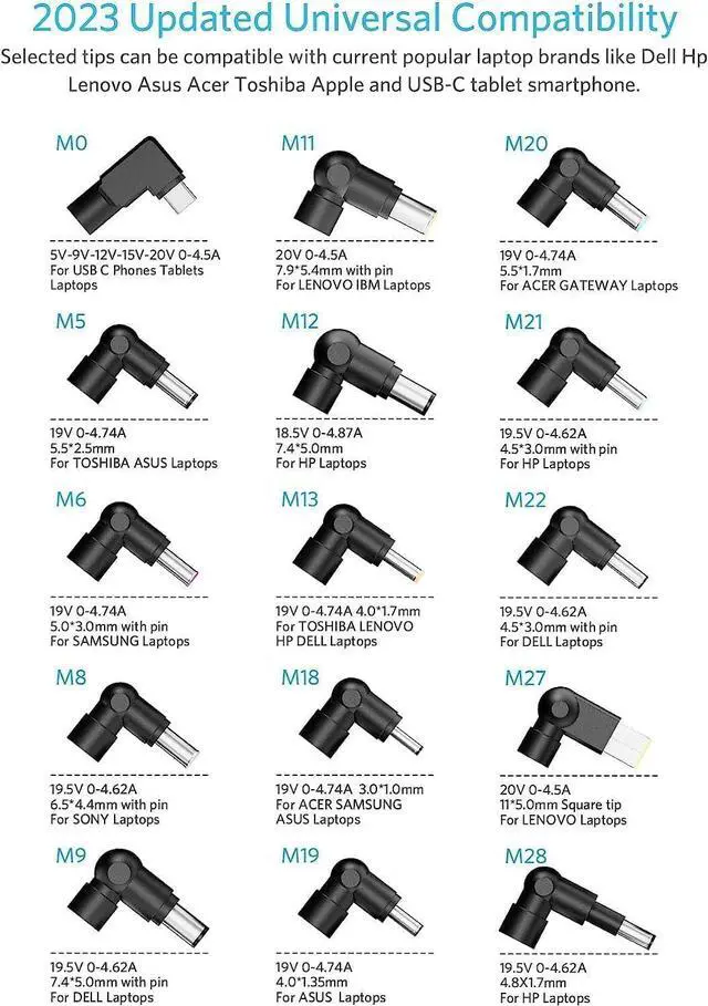 Universal Laptop Charger - This 90w laptop charger is with multiple plugs which can be compatble with most HP Dell Asus Lenovo Acer Toshiba Samsung 65w 45w laptop chargers and more other ultrabooks chromebooks. Power Specification -