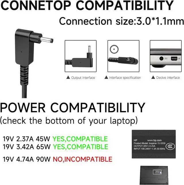 Product SpecificationOutput: 65W 19V 3.42A (also compatible with 45W 19V 2.37A ).