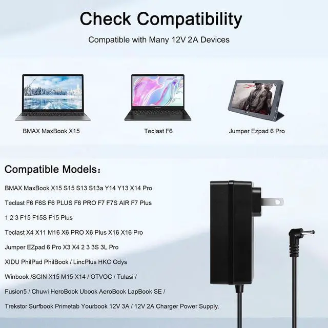 Compatible with Teclast F6 F6S F6 PLUS F6 PRO F7 F7S AIR F7 PLUS 1 2 3 F15 F15S F15 Plus 12V 3A / 12V 2A Charger Power Supply