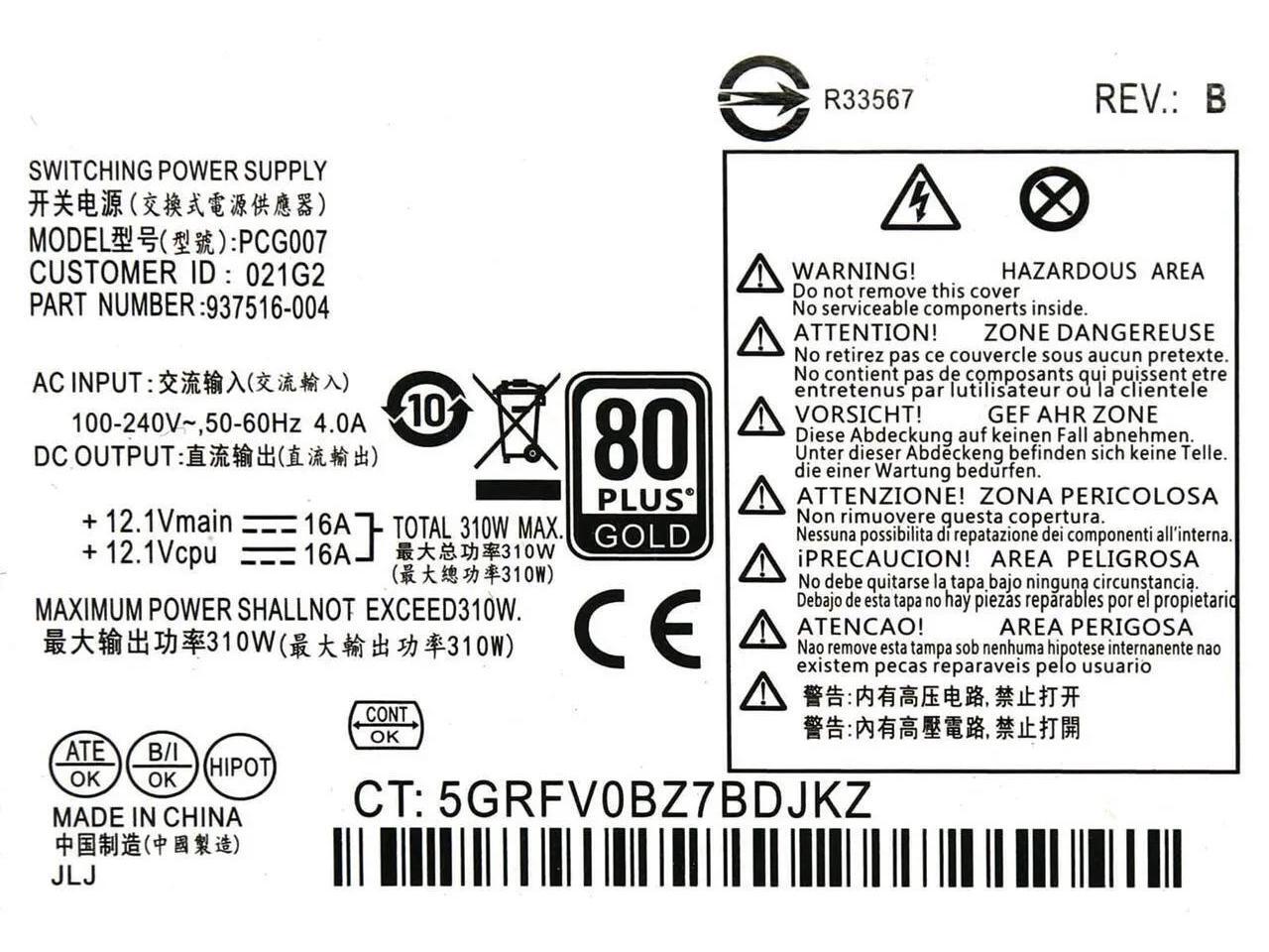 AC INPUT : 100-240V~,50-60Hz 4.0A Max Output Power:310W