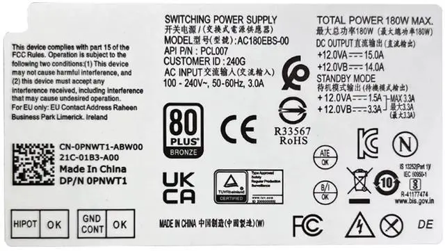 AC180EBS-00 180W Power Supply Replacement for dell Ispniron 3910 Vostro 3690 3710 Optiplex 3900 3901 3990 3991 MT H180EBS-00 D180EBS-00 NC77H T685J F3J97 PCL007 1756V Connector:(8+4)pin