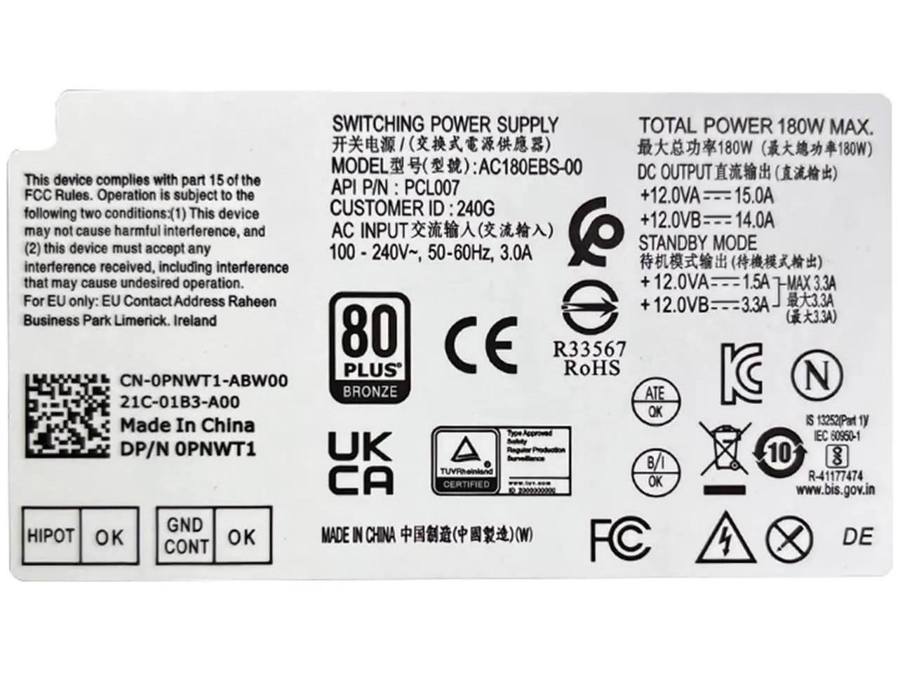 AC180EBS-00 PCL007 180W Power Supply Replacement for dell Ispniron 3910 Vostro 3690 3710 Optiplex 3900 3901 3990 3991 MT H180EBS-00 D180EBS-00 NC77H T685J F3J97 1756V Connector:(8+4) pin