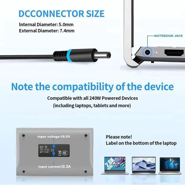 Specifications: Input Voltage: AC 100-240V,50/60Hz, Output : DC 19.5V, 12.3A, Power Wattage: 240 Watt (Compatible with 19.5V 9.23A 180W; 19.5V 7.6A 150W; 19.5V 6.7A 130W; 19.5V 4.62A 90W), Outlet: 3-prong, Connecter size: 5.0mm x 7.4mm