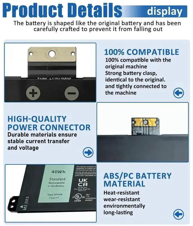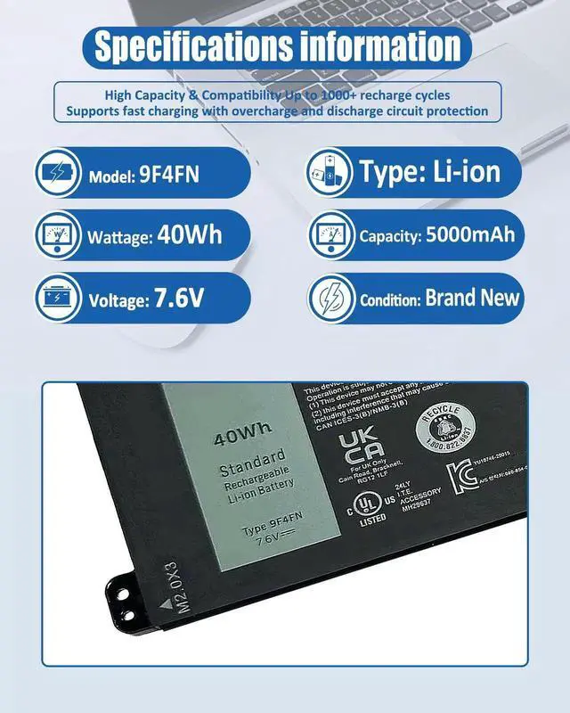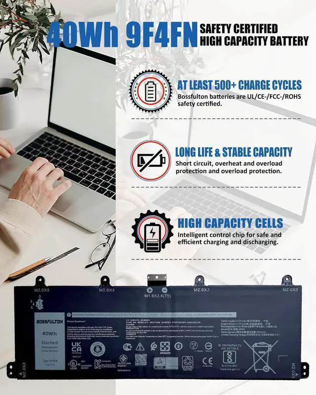 Battery SpecificationsModel Name: 9F4FN Battery, Voltage: 7.6V; Capacity:40Wh; Color: Black. More than 500 cycles, Packages includes: 1x 9F4FN Battery ,1 Set x Screwdrivers,1x Instruction for 9F4FN Laptop Battery