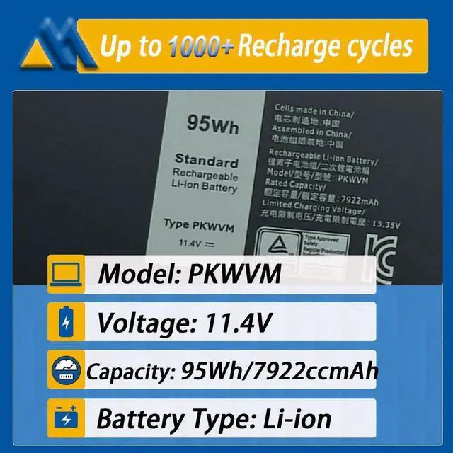 Tech Specs & 100% New Products Model: PKWVM Voltage:11.4V Capacity: 95Wh/7922ccmAh Battery type: Li-ion. (We only use grade A battery cells that provide up to 500 recharge cycles over the life of the battery. Come with screwdrivers.)