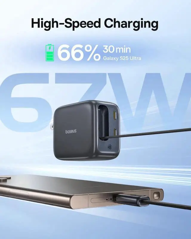 Baseus Enercore CJ11 Retractable USB C Charger, 67W 3 in 1 Fast Charging Block with Foldable Plug, PD/PPS for Galaxy S25/iPhone 17/16/15 Series/MacBook Air/Airpods 4