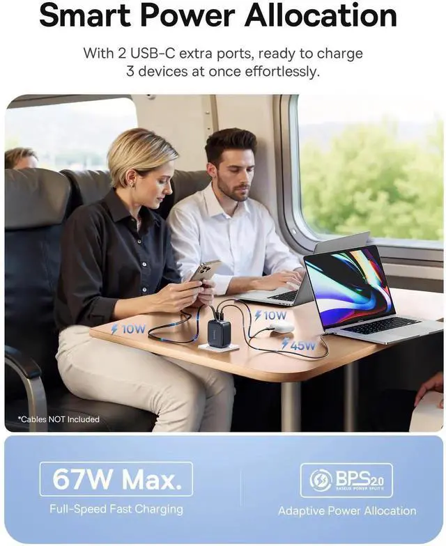 67W Fast Charging: Enjoy the convenience of powering up two devices at the same time! This 67W USB C charger block comes with 2 additional type c port and 1 retractable cable, allowing you to power up three devices at once! It can charge your MacBook Pro 14 to 43% in 30 minutes.