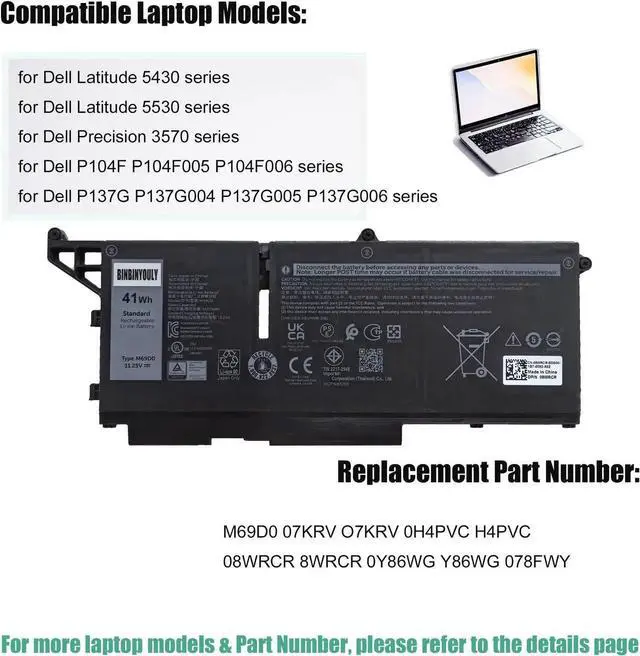 M69D0 Battery Replacement for Dell Latitude 5430 5530 Precision 3570 P104F P104F005 P137G P137G004 Series Laptop 07KRV O7KRV 0H4PVC H4PVC 08WRCR 8WRCR 0Y86WG Y86WG 078FWY 11.25V 41Wh 3467mAh