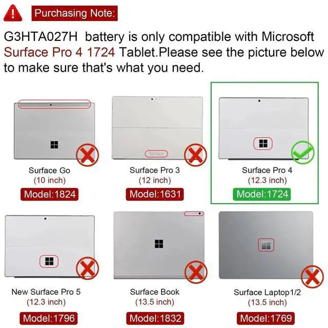 Replacement for : Microsoft Surface Pro 4 1724 12.3 inch Series. (NOT FIT: Surface Go 1824, Surface laptop 1/2 1769, Surface Pro3 1631, Surface Pro5 1796, Surface Book 1832.)