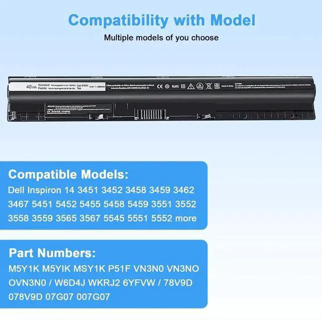 M5Y1K 14.8V 40wh Battery Replacement for Dell Inspiron 14 15 17 5000 3000 Series 5559 5558 3451 3452 3458 3551 5458 5755 5756 5758 5759 P47F P51F P52F P63F P64G 453-BBBQ GXVJ3 WKRJ2 HD4J0 991XP VN3N