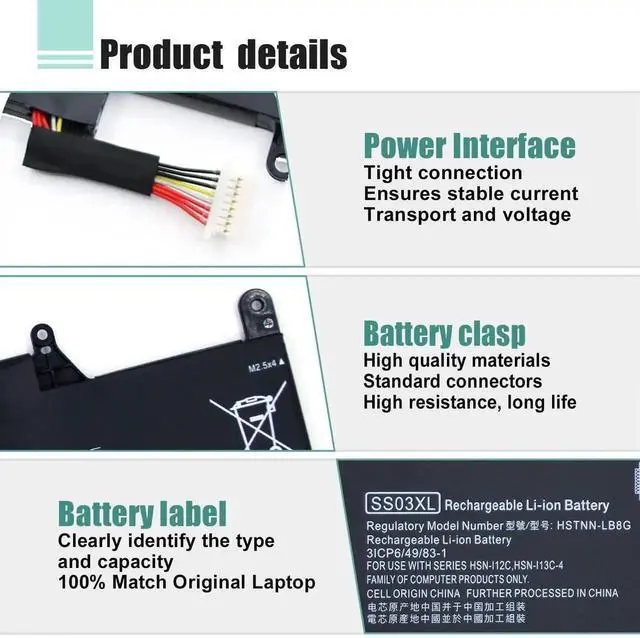 SpecificationsBattery Model : SS03XL, Voltage: 11.55 V, Capacity: 50Wh 4330 mAh. Color: Black. Type: Li-ion Battery. Up to 1000+ recharge cycles over the life of the battery. Packaged Included: 1 battery 1 Instructions 4+1 matching installation tools. Packaged by sponge or bubbles to prevent damage