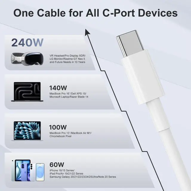 Universal Compatibility: This usb c to c cable Compatible with 240W/140W/100W/65W /60W /45W /35W /30W /25W / 22.5W /20W /18W /15W/12W All USB C charger. widely compatible with iPhone 16/16Pro/16Plus/16Pro Max/15/15 Plus/15 Pro/15 Pro Max MacBook Pro 13 inch Macbook Air 13 /m1 Inch MacBook 12 inch Pad Pro 12.9 /11 inch Pad Air 4/5 Pad Mini 6 Google Pixel 6/6 Pro/5/5a Galaxy S24/S23/S22/S21/S20/S20+/S20 Ultra Galaxy A53/A73/A71 Galaxy Note 10/10+/20 Ultra Switch PS5 and other USB-C port devicesUSB