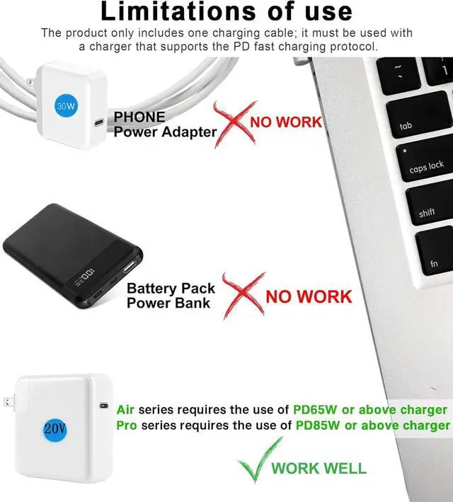 (Model number: A1424 A1398 A1465 A1466NOTEMac Air must use a PD65W 20V or above charger; Mac Pro must use a PD85W 20V or above charger. (Cannot use mobile phone chargerThe charger used is too low power or does not have PD protocol to power the laptop. )5-Pin Magnetic ChargingThis Magnetic 2 charging cable uses 5-Pin magnetic charging which makes charging convenient and prevents tripping. Material characteristicsCable length is 6ft It is made of TPE wire material and aluminum port. Lightweight and convenient. Important NoteThis product only includes one charging cable and must be used with a charger with PD protocol 65W 20V or higher. The magnetic interface must be kept clean otherwise the automatic charging protection may be triggered.