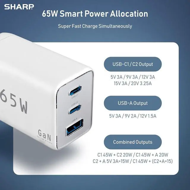Small and Compact: GaN Technology allows us to make the Sharp 65W charger smaller than traditional 65W chargers. Take it with you wherever you go and always have access to charge when you need it! Designed with foldable plugs for a compact design for easy portability.