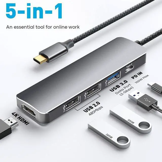 5-in-1 USB-C HubEnjoy all-around connectivity with this 5-in-1 USB Type-C HUB which comes equipped with a 100W Power Delivery input two USB-A 2.0 ports one USB-A 3.0 port and a 4K@30Hz HDMI port.