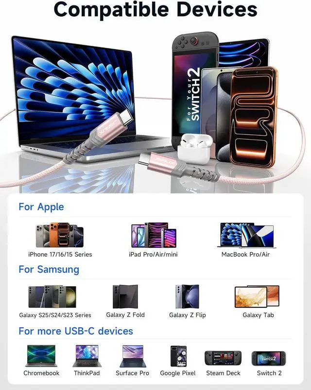 List: Compatible with iPhone 16 iPhone 16 Pro iPhone 16 Plus iPhone 16 Pro Max iPhone 15 iPhone 15 Pro iPhone 15 Plus iPhone 15 Pro Max Galaxy S25 S24 Ultra S23 S22 S21 S20 Plus Ultra Note 20 10 and 20 10 Plus Google Pixel 7 6 5 2 3 4 XL iPad Pro 2022/2021/2020/2018 iPad Air Steam Deck and more upcoming devices with USB C portWhat