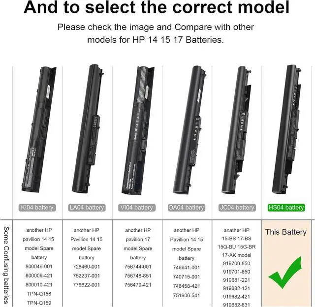 Perfect Replacement for HP spare 807611-131, 807611-141, 807611-221, 807611-241, 807611-251, 807611-421, 807611-831, 807612-131, 807612-141, 807612-221, 807612-241, 807612-251, 807612-421, 807612-422, 807612-831, 807956-001, 807957-001, 843532-851, 843533-851, HS03 battery, HS03031-CL, HS04 battery, HS04041, HS04041-CL, HSTNN-DB7I, HSTNN-LB6U, HSTNN-LB6V, HSTNN-PB6T, M2Q95AA, M2Q95AA#ABA, N2L85AA, N2L85AA#ABB, TPN-I119, TPN-I120